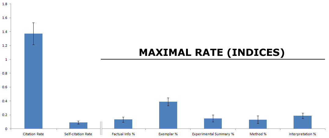 Recently, I was motivated to investigate how articles are cited within papers and contribute to this area of inquiry. In other words, how do authors use the references they cite? To do this, I chose 10 recent articles at random from major journals [4]. These articles represented several different fields of science (e.g. Neuroscience, Computational Science, Cell and Evolutionary Biology). I then constructed seven measures: two indices (citation and self-citation) and five categories of membership (factual information, method, interpretation, exemplar, and experimental summary) [5].